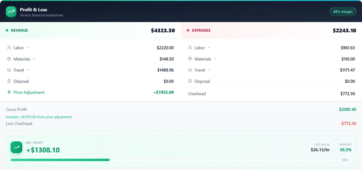 “The travel time calculation alone was a wake-up call. We were driving 40 minutes to some jobs and never charging for it. That was costing us $80+ per trip in labor and fuel. We stopped taking jobs over 25 minutes away unless the margin justifies it.”